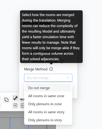 This will convert the plenum properties assigned to the rooms into real plenum rooms on their own plenum story, which you can see on the canvas of the model editor. From there, you can use the Merge Rooms command to merge the plenums together that are a part of the same zone. Then the plenum for each zone will be exported as a single room in the IESVE GEM.