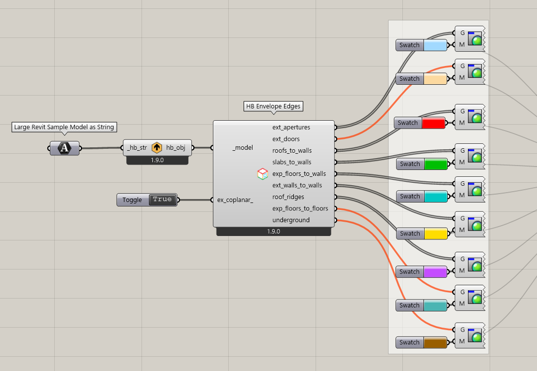 Here is a sample Grasshopper file showing how you can use it to visualize the different edge conditions across the large Revit sample model: