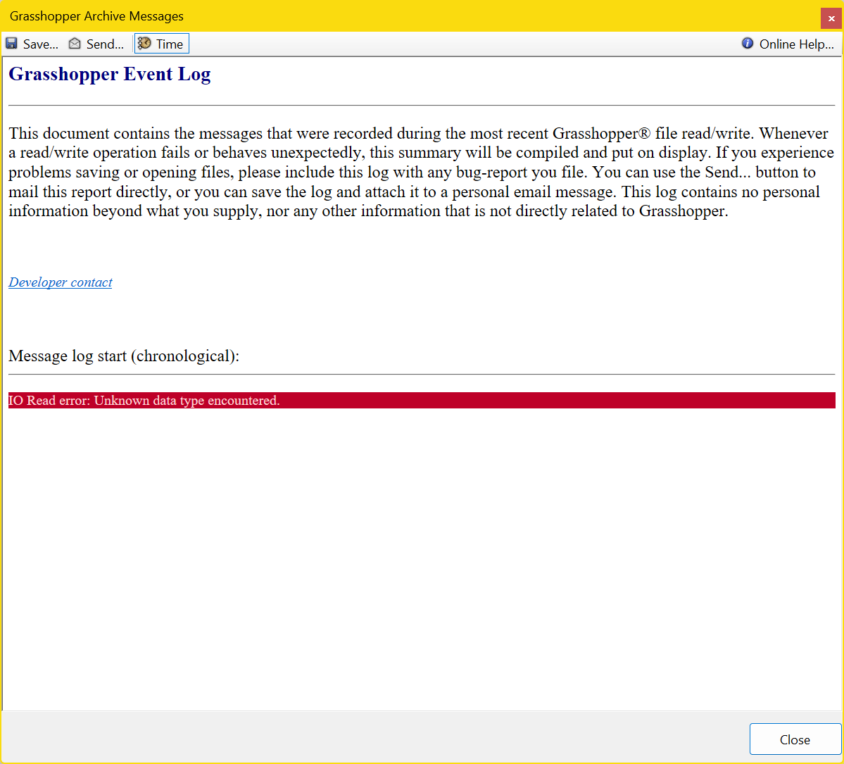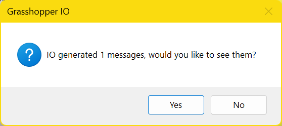 I was still not able to create @thedonn 's Grasshopper IO warning but it reminds me of the warnings that I get when I save a .gh file to a remote storage folder like Google Drive or Dropbox. Maybe try re-downloading the latest version of that sample file into your downloads folder, open it from there, and see if you still get it?