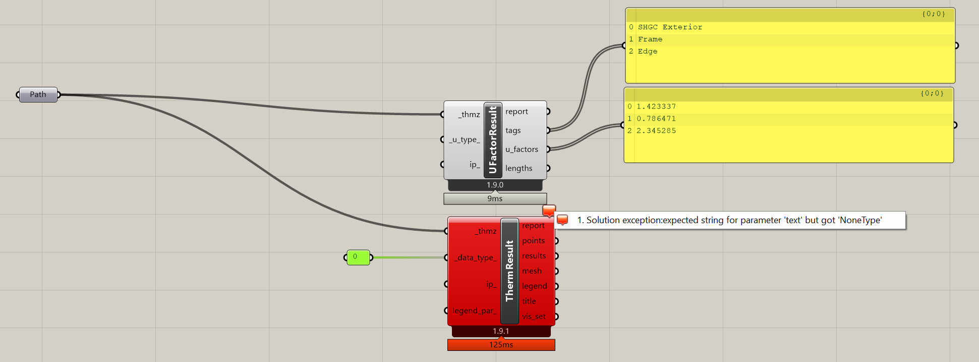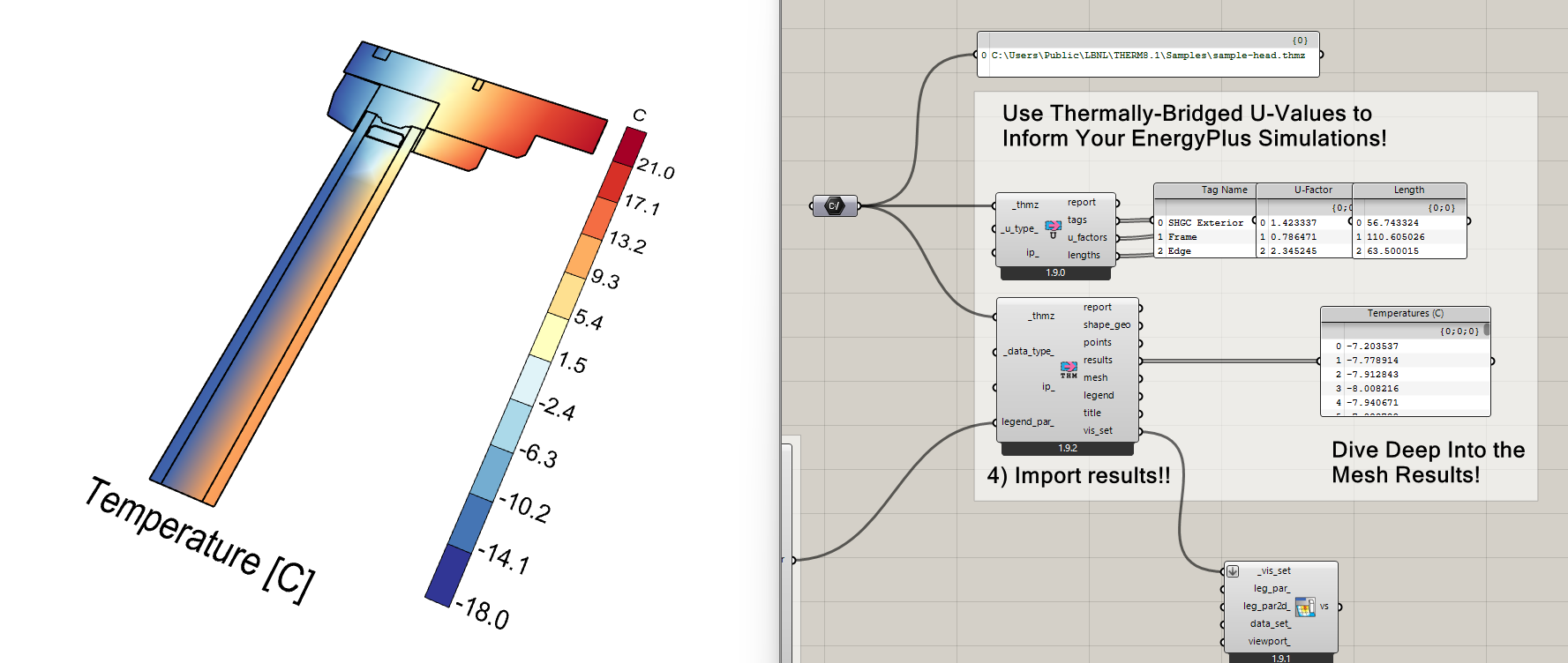 I fixed the bug that @thedonn found in the âRead THERM Resultâ routine that was causing it to fail to import the samples distributed with the THERM installation. These samples can now be imported with the âFF Read THERM Resultâ component: