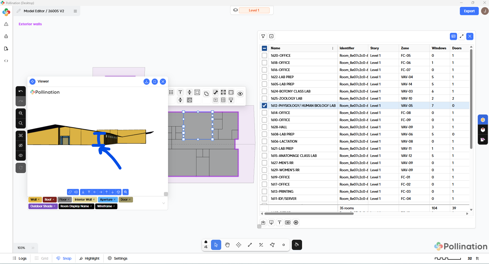 I’m seeing my trace model exported with walls matching the lecture hall in all exterior walls in labs and offices. See my below screen shot to expore 1612 - Physiology Lab.