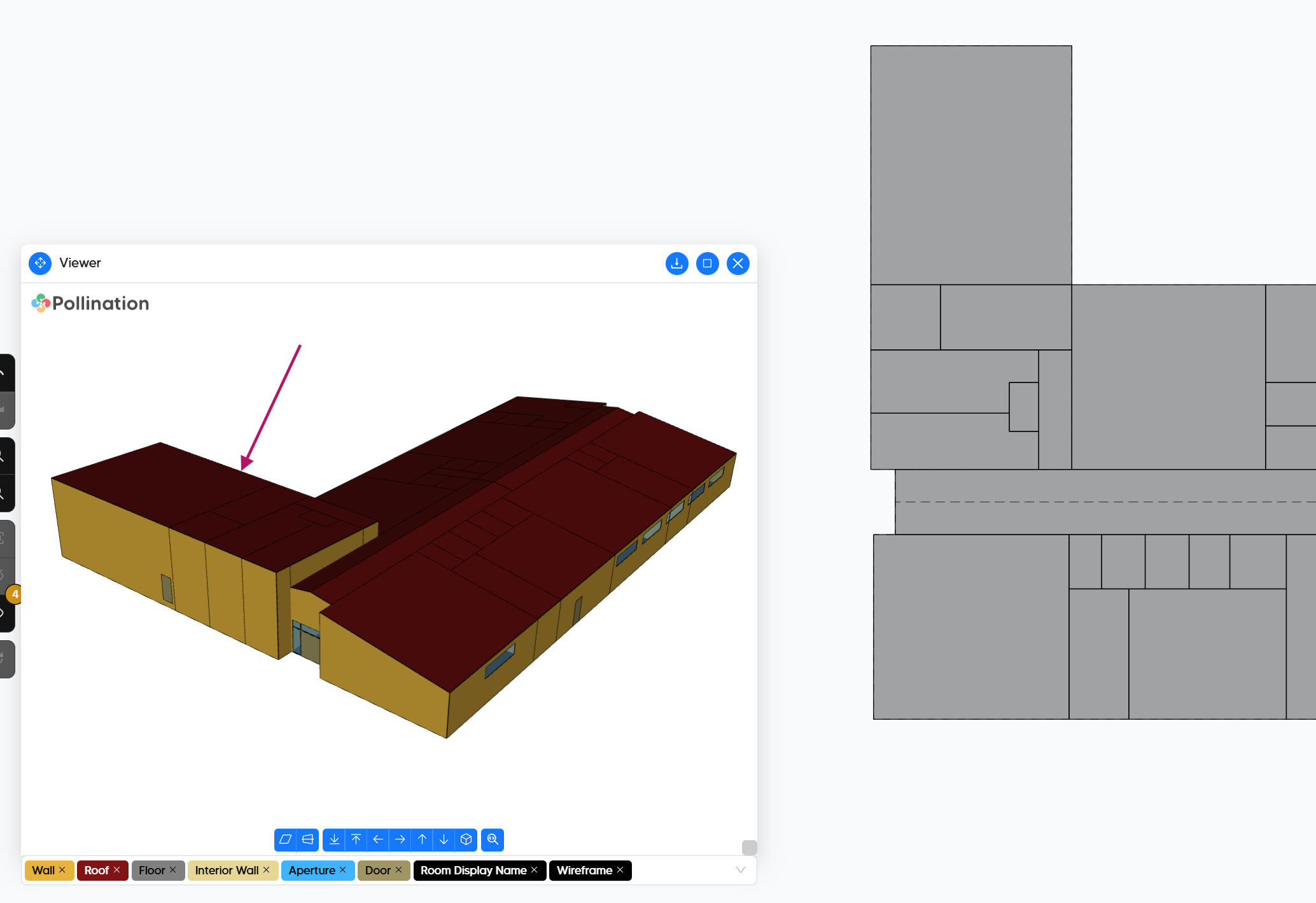 When Pollination exports the model as TRACEXML it does several simplifications. You can see the full list here. The first item is that all the pitched roofs are translated to horizontal roofs. That is mainly because of the TRACE 3D Plus gbXML importer limitation. This is how your model looks like. The default approach is to keep the extruded volume as close as possible to the original volume.