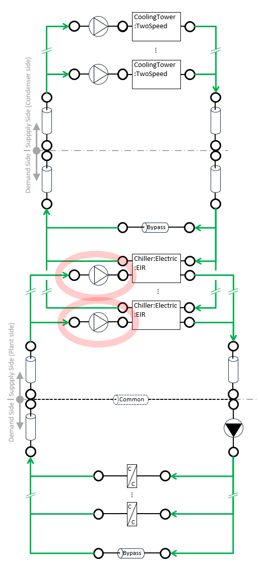The connection in the image below creates a primary chilled water pump at the supply side inlet branch. This is not what I want to model.
