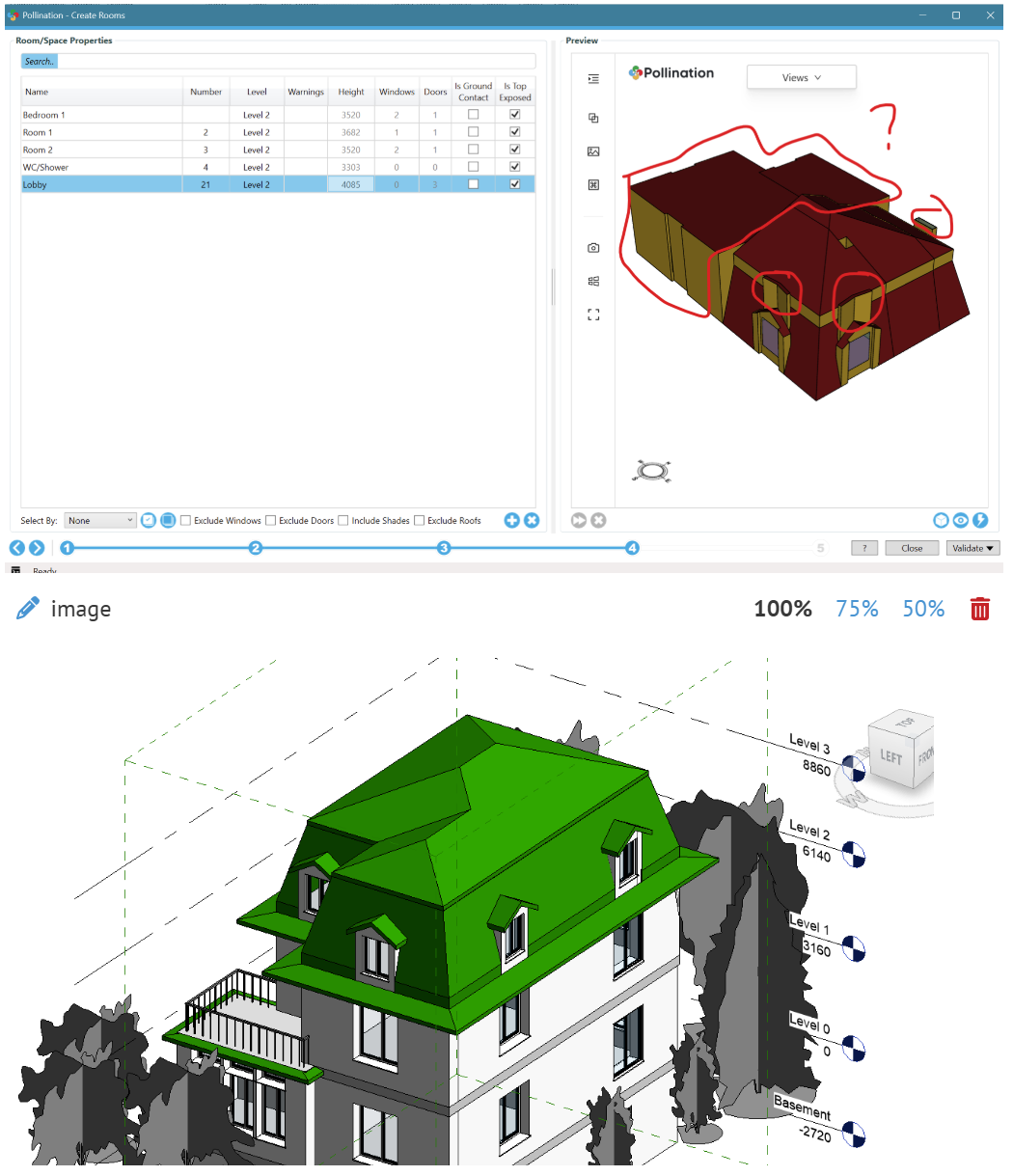 I tried the Revit plugin for a heritage single family home in Bern, Switzerland which I modelled on Revit. It has a mansard roof with 5 dormers (screenshot attached of building). Before taking it to Pollination, I modelled only 1 dormer to try to export the model as .hbjson. The model was validated without issue and I was quite impressed, except one problem - there was a weird extrusion just above the dormer roof, and I assume it had something to do with the room volume. I tried to change the room height, ensured all walls and roofs were room bounding and also tried to add room sep lines in the plan to see if it does something, to no avail. It got even more frustrating after I added the other 4 dormers, since the same issue with the topmost level persisted and I am still struggling to find a way to get the true geometric volume of the attic level (the room outline in the preview should be the volume of the mansard roof). As a result, the uppermost level (attic/lvl 02) is not the true room volume, it appears to have a flat roof and there are some extrusions where the dormers are.