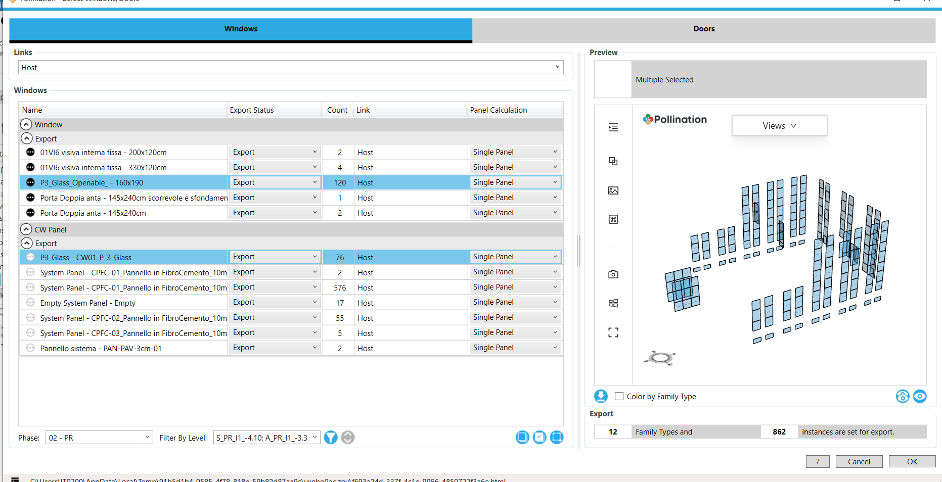 I am having an issue with windows not being correctly included in the Pollination model snapshot, despite setting the export status correctly in the Revit plugin. Export Status: I have verified that the status for the relevant window families is explicitly set to. (See Select_windows.PNG screenshot).