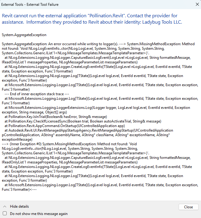 I recently installed the Pollination plugin for Revit to test out the free trial, and was met with this " System.AggregateException" error upon Revit startup.