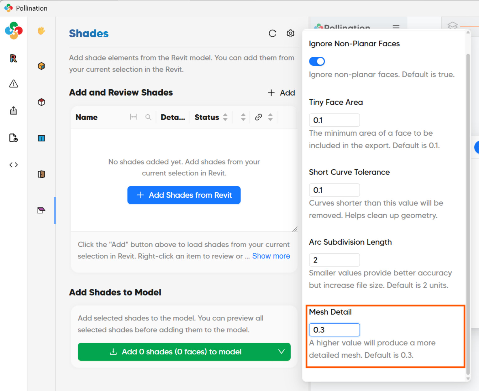 One piece of good news is that in Revit plugin v3, we have exposed the input that allows you to change the “Mesh Detail” level. Hopefully, that could help with generating geometries with not as many faces.