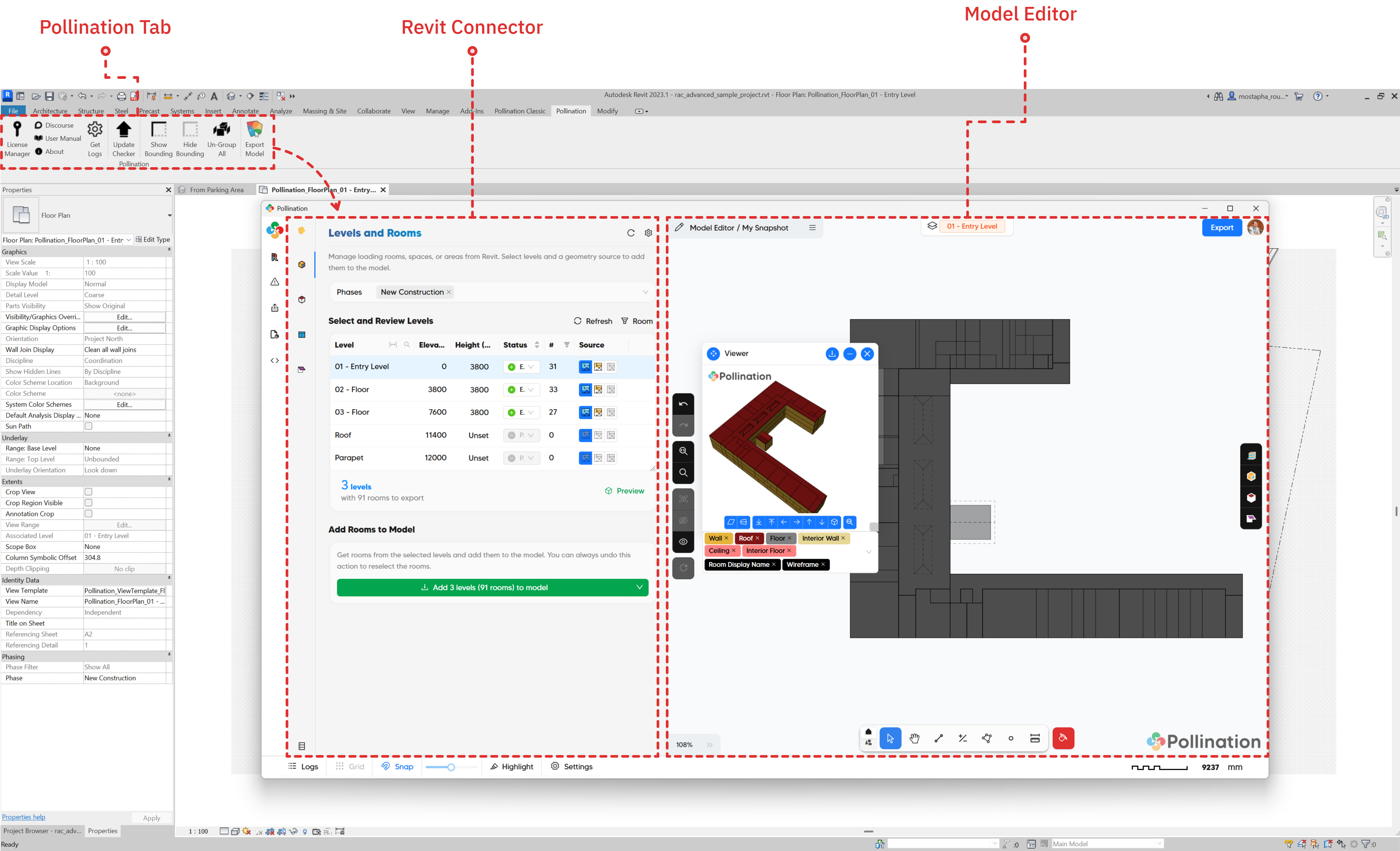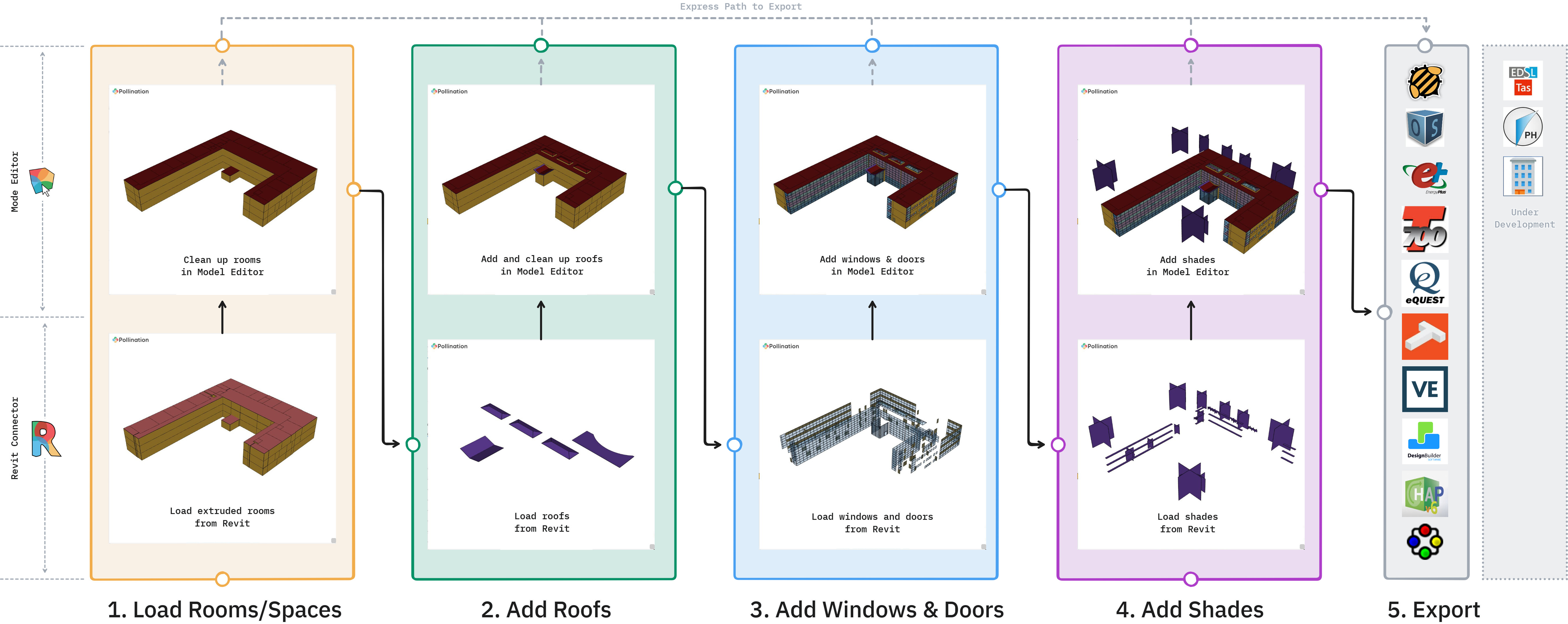 A three-part architecture is the engine behind the “forgiving” workflow I mentioned above. It starts with the Pollination Tab in Revit, which communicates through our new Revit Connector to the Model Editor.