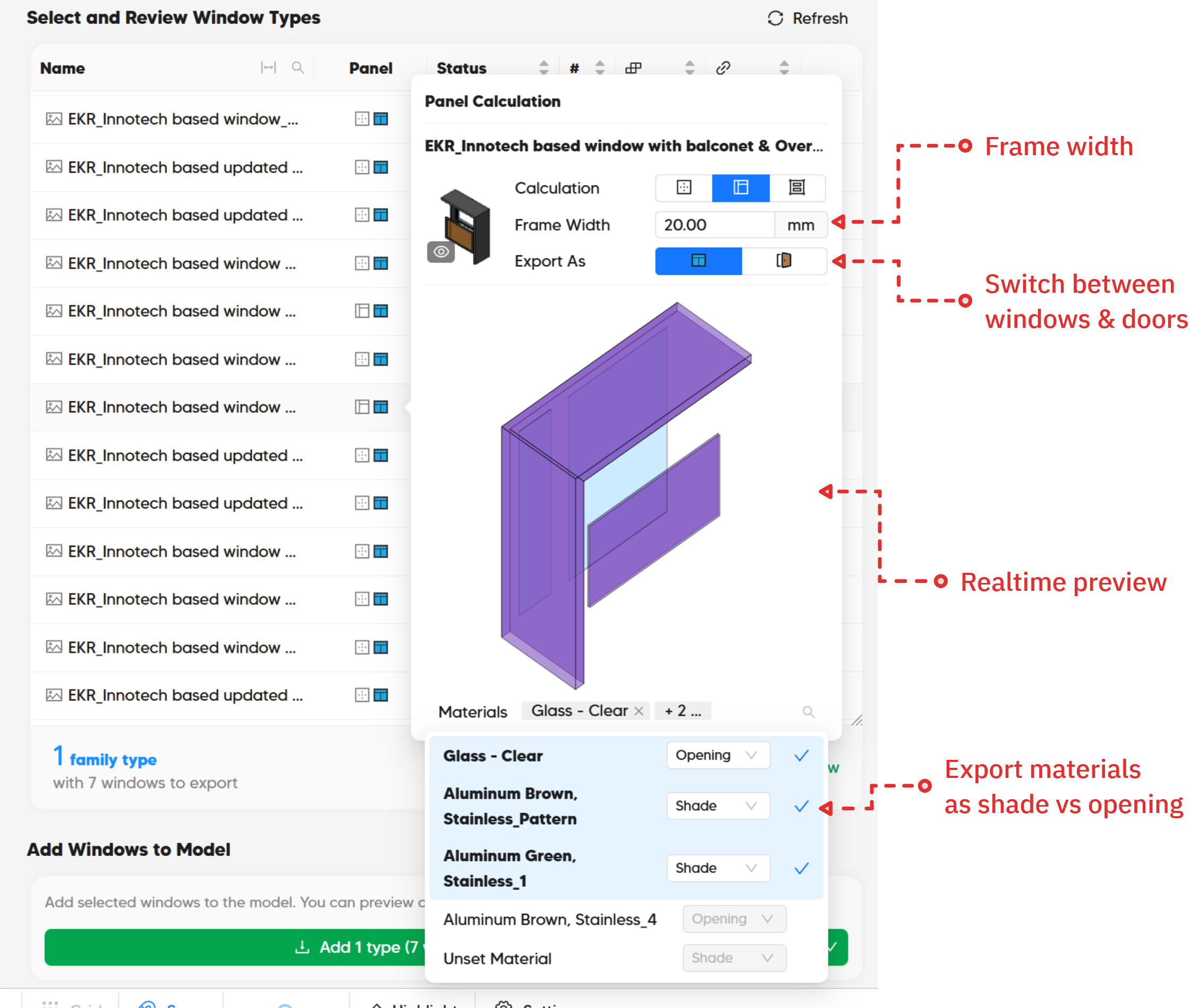 - Frame Width: You can now include precise frame thickness for each window family in your exports, ensuring meeting the requirements of certain compliance modeling.
