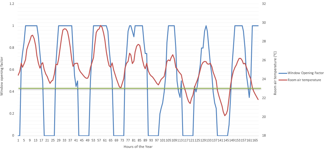 One thing I noticed in the AFN script was that the window opening profiles might not be behaving as expected? It seems like during the UK summer months (the plot below selected for HOYs 5287-5453, so around August time), the windows don’t seem to be opening at night even though the room air temperature exceeds 23 degrees for quite a lot of the hours, which meant my bedrooms were getting fails when tested against the TM59 criteria.