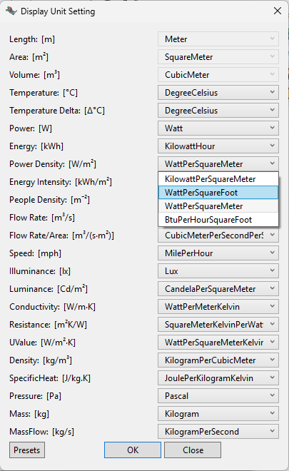Program types have load values only in terms of W/m^2. Standard practice for us is to use W/ft^2 values. If there were an option to toggle the units would be great.