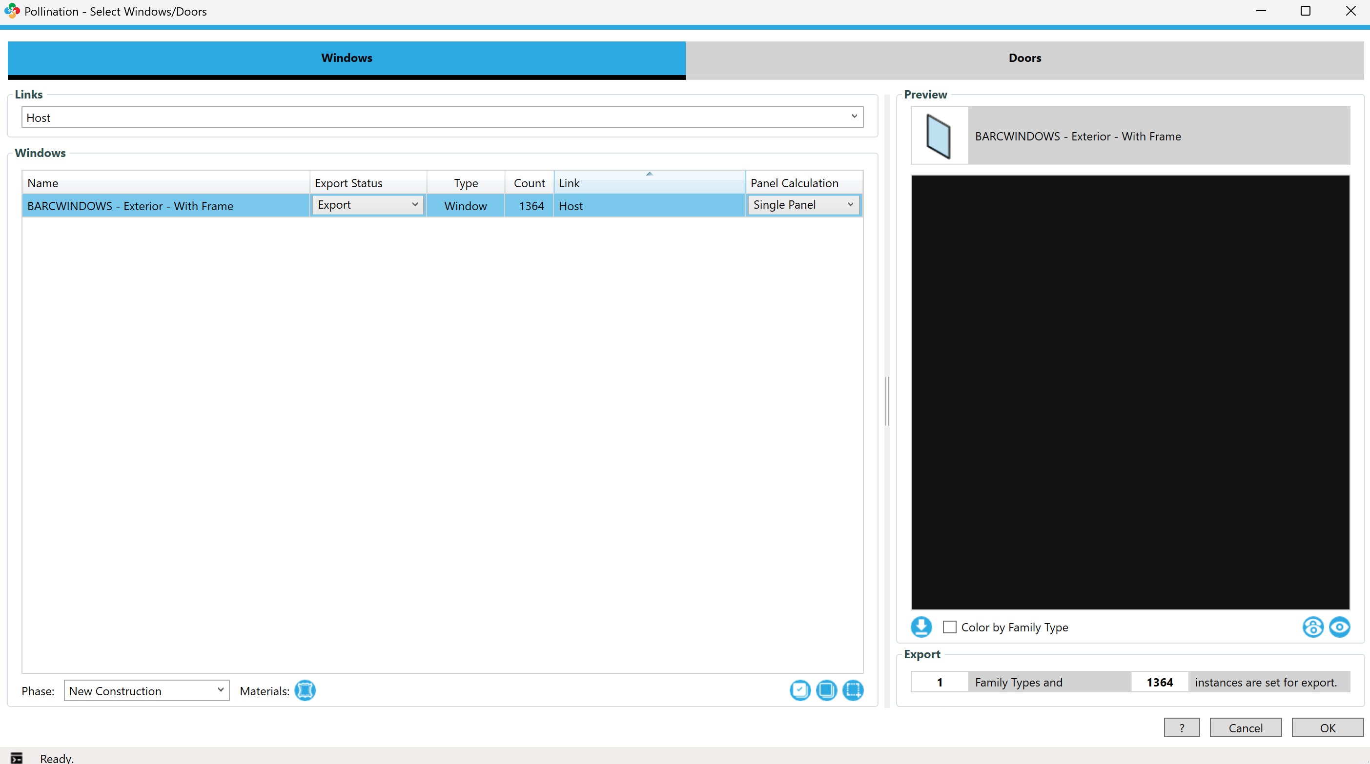 You’re right and this windows don’t show up in the Revit plugin classic as-is. I had to add a parameter to each material (whatever that means) for the materials to be identifiable by the Revit plugin. The rest of the process was straightforward.