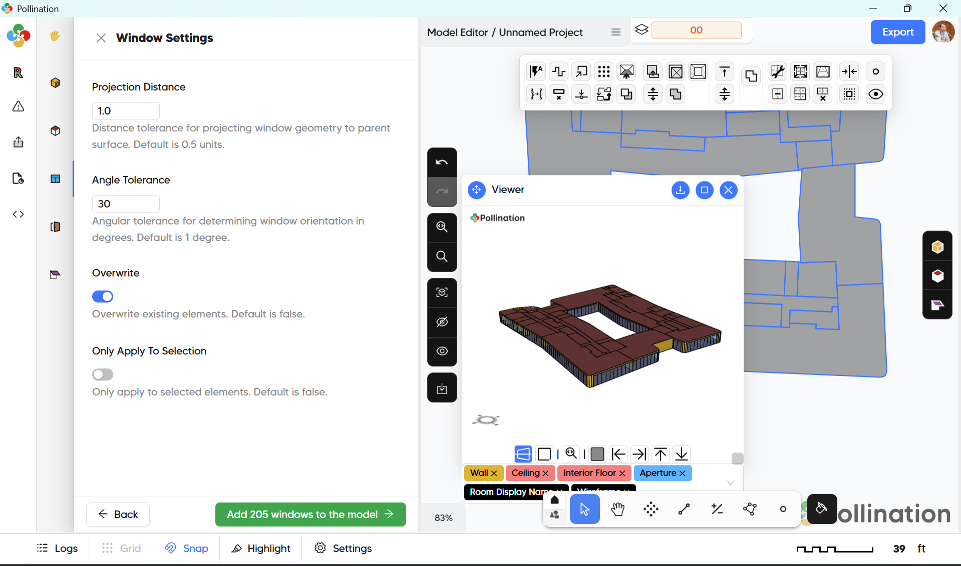 I am facing some more issues with the exporting of a model. In first place, pollination does not recognize the windows I am using (maybe because they were tailor-made for our BEM projects). I set them to export, but I can’t see them on the window on the right side: